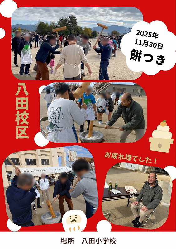 八田校区の餅つき行事も、子供達や地域の方々の活気に満ち溢れていました。みんなで協力して作ったつきたての温かいお餅の前では、自然と笑顔がこぼれます!